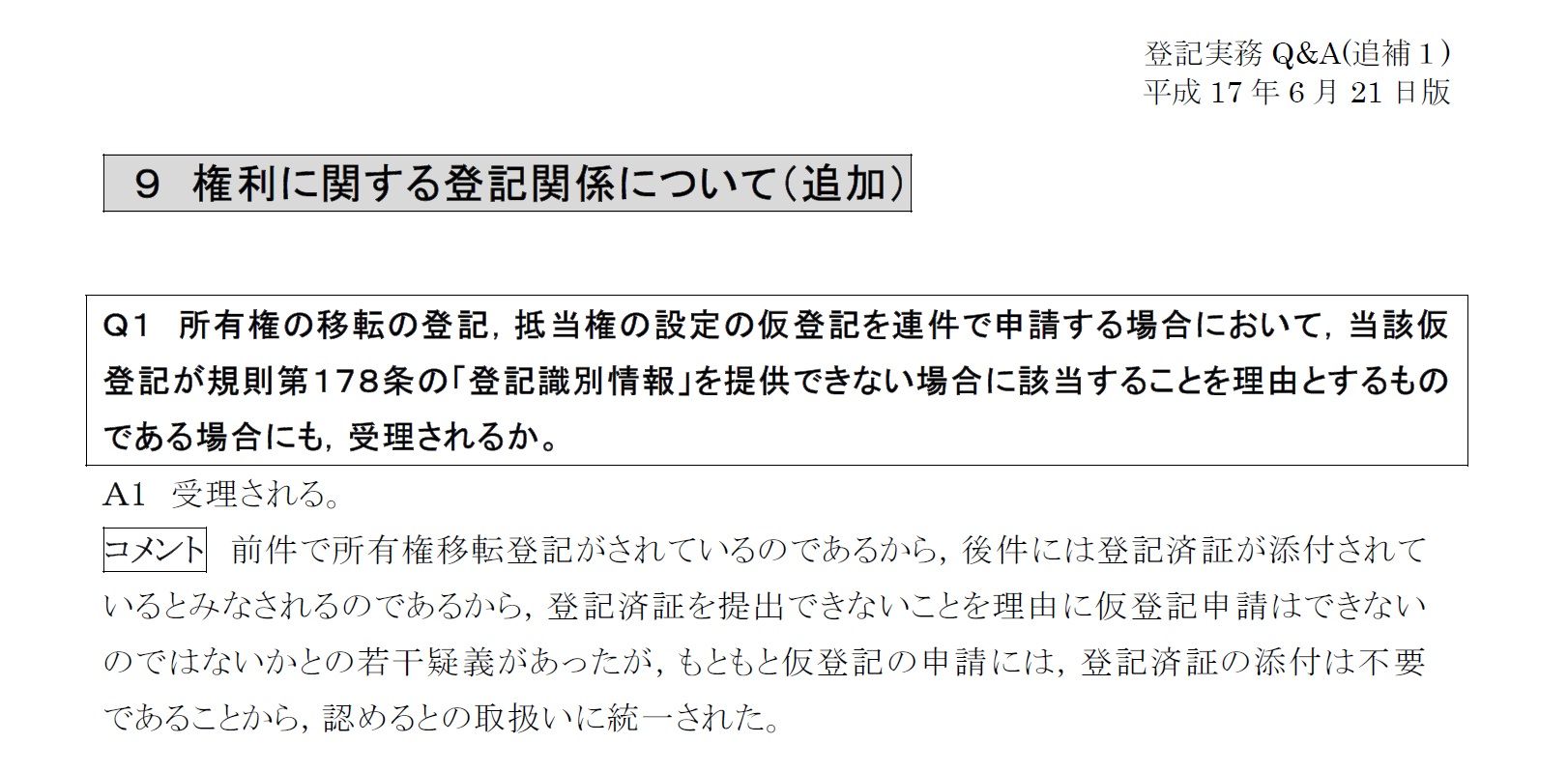 1号仮登記の申請の可否の件で三田さんからコメントを頂きました。