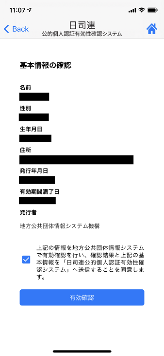 ¥Á¥§¥Ã¥¯¤òÆþ¤ì¤Æ¡¢¡Ö͸úÀ³Îǧ¡×¤ò¥¿¥Ã¥×¤¹¤ë¤È¥Ç¡¼¥¿¤¬¡ÖÆü»ÊÏ¢¸øÅª¸Ä¿Íǧ¾Ú͸úÀ³Îǧ¥·¥¹¥Æ¥à¡×¤ËÁ÷¿®¤µ¤ì¤Þ¤¹¡£
