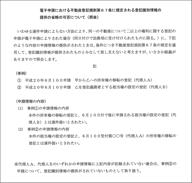 あくまで「電子申請における不動産登記規則第67条に規定される登記識別情報の提供の省略の可否について」に関する先例でしかありません。