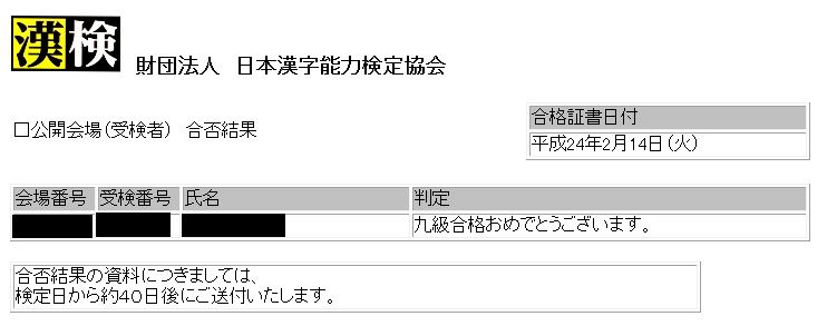 そうそう、1月29日に長女が受検した漢字検定(漢検)9級。