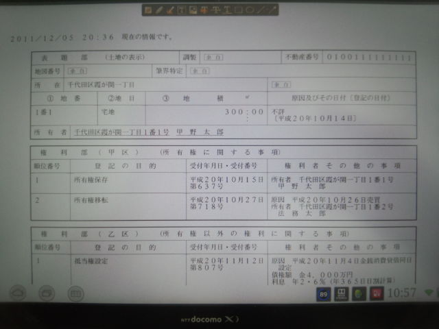 その後、さっきとは逆に、パソコンンでダウンロードしたファイルをAndroidタブレットに取り込んで表示させたところ、こちらも問題なく登記情報が表示されました。
